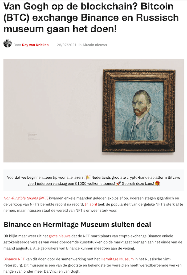 Beste kunstliefhebber, alvast bedankt voor uw interesse in de kunst van sedas. Van het kopen van decoratieartikelen tot unieke kunstwerken, bitcoin kan overal gebruikt worden. Wenst u een origineel kunstwerk aan uw collectie toe te voegen? Nu veroveren ze de wereld. Je kan als het ware een eigen database met interessante kunstwerken aanleggen. Onze geolocalisatietool laat dan weer toe de kunstenaars in je eigen regio te ontdekken." Beste kunstliefhebber, alvast bedankt voor uw interesse in de kunst van sedas. Of gaat uw voorkeur uit naar een gelimiteerde, digitale print of een met sedas kunst bedrukt artikel? De toekomst ontdekken via online crypto kunst ? Dit digitale plaatje kostte kunstliefhebber 60 miljoen euro (maar is hier gratis te zien. Beste kunstliefhebber, alvast bedankt voor uw interesse in de kunst van sedas.